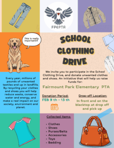 The Fairmount Park PTA is hosting a clothing drive at the school! Bring your unwanted, gently used clothes, shoes, and bags to the blacktop or the front of the school at drop off and pick up any day in the week of February 9-13. PTA members will be available in both locations to assist with collecting your items. Help the environment by recycling clothing, support our school, and clean out those closets! This initiative helps support our general PTA fund and budget for next year.